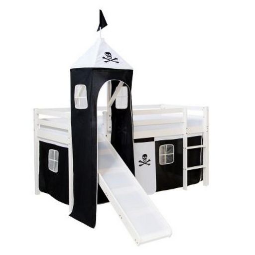 Ce lit superposés apporte la danse et de la lumière aux yeux des enfants. Un paradis pour les jeux propre et un bon sommeil. Avec ce produit, vos enfants peuvent vivre des aventures imaginatives pendant la journée et dormir paisiblement la nuit. Pour éviter le danger en grimpant et sautant autour, les bords du lit sont arrondis qui permet une protection et empêche vos enfants de tomber. L´échelle peut être monté sur les deux côtés, de sorte que le lit est flexible vos conditions spatiales. Dimensions Superficie (L x P): 90 x 200 cm Dimensions extérieures (W / H / P): 207 x 150 x 97 cm Hauteur de Tête du lit et le bois de pin: 112 cm Profondeur du planché des matelas 4 cm Epaisseur Post: 40mm Épaisseur: 20 mm Sommier à lattes inclus