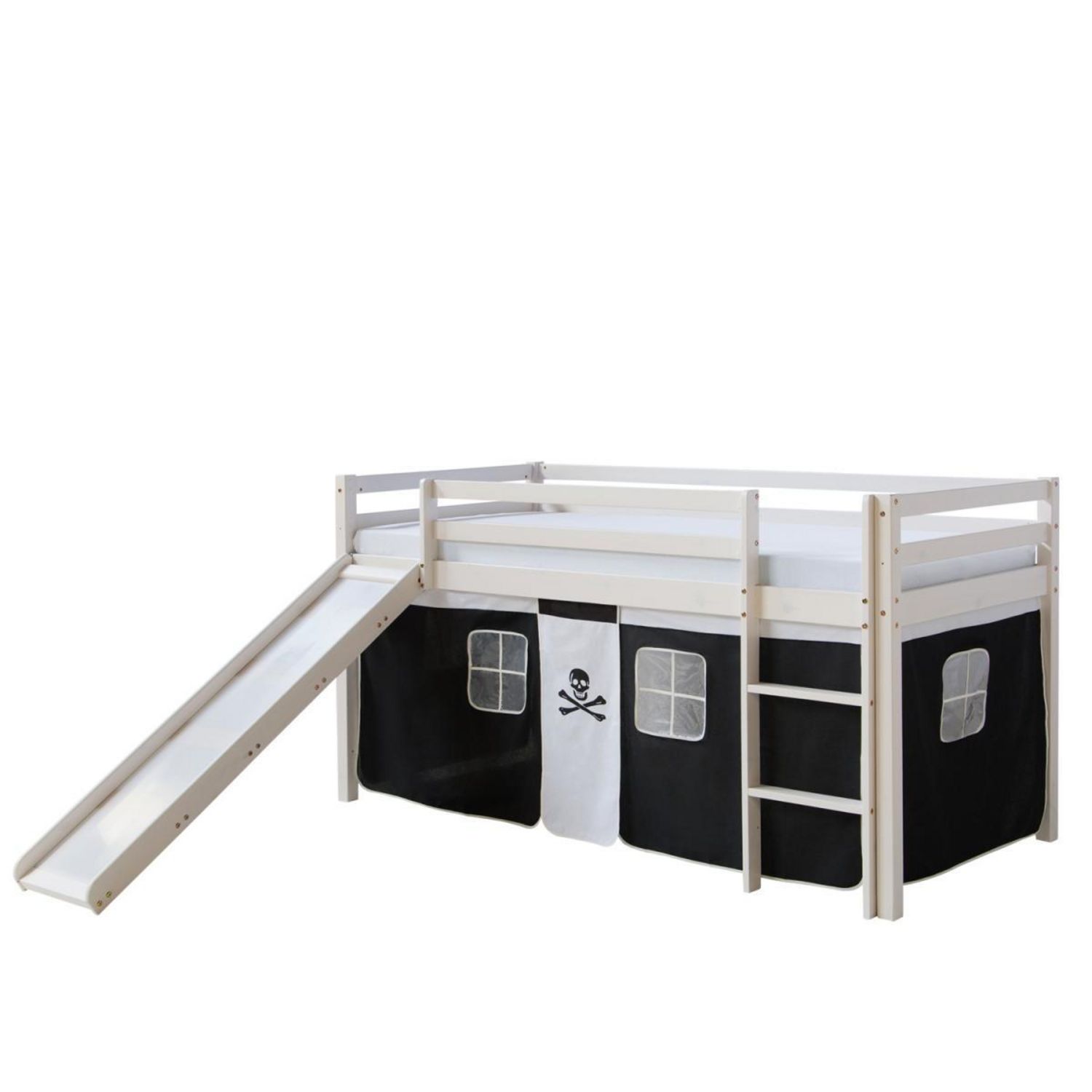 Lit Simple Blanc 90x200 en hauteur avec echelle et rideau Foncé et toboggan