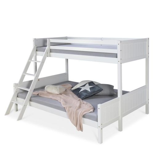 Lit superposé moderne avec échelle équipé de 2 plans de couchage dont 2 matelas et sommier à lattes. Le plus grand lit inférieur pour 2 personnes maximum mesure 140 x 200 cm et le lit supérieur mesure 90 x 200 cm avec bordure de sécurité. Le lit mezzanine en bois de pin est peint en blanc. Le lit superposé pour enfants peut être utilisé comme endroit idéal pour dormir ou comme lit de jeu dans la chambre des enfants ou la chambre des jeunes ou pour des visites spontanées dans la chambre d'amis. Le lit superposé double peu encombrant et multifonctionnel pouvant accueillir jusqu'à 3 personnes est donc particulièrement adapté aux familles avec plusieurs enfants. L'échelle légèrement inclinée adaptée aux enfants avec quatre marches plates permet de monter facilement jusqu'au lit supérieur. Les façades des sections de tête et de pied ont une structure rainurée sur un côté et peuvent donc être montées de manière variable vers l'intérieur ou vers l'extérieur, en fonction de la composition de la pièce et de l'aspect souhaité. 2 matelas assortis sont déjà inclus dans la livraison. Matelas pour berceaux 90 x 200 cm et 140 x 200 cm blanc - adapté au plan de couchage : 90x200 cm ou 140x200 cm - Epaisseur totale du matelas jeunesse : 12 cm - Degré de dureté 2 - durable et indéformable - adapté aux personnes allergiques - Sans CFC Sommier inclus