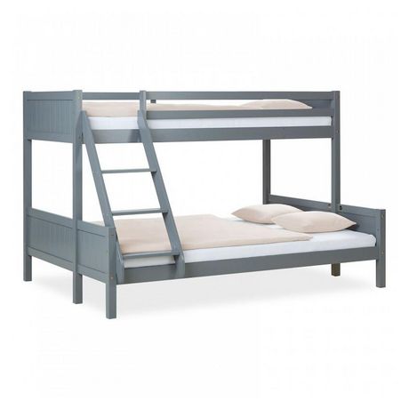 En savoir +Le lit superposé pour enfants peut être utilisé comme lit de sommeil ou de jeu idéal dans la chambre d'enfants ou la chambre d'adolescent, ou même pour des invités imprévus dans la chambre d'amis. Par conséquent, le lit superposé multifonctionnel et gain de place pour jusqu'à 3 personnes est particulièrement adapté aux familles avec plusieurs enfants. L'échelle inclinée légèrement inclinée avec trois marches plates facilite la montée jusqu'au lit supérieur. Les faces de la tête et du pied sont pourvues d'une structure rainurée d'un côté et peuvent être montées vers l'intérieur ou l'extérieur, en fonction de l'aménagement de la pièce et du look souhaité. Détails du produit : lit superposé avec 2 zones de couchage de tailles différentes en gris comprend des sommiers à lattes pour chaque lit de 90 x 200 cm et 140 x 200 cm (composés de 2 sommiers à lattes individuels de 70 x 200 cm chacun) échelle pouvant être montée du côté droit ou gauche avec 3 marches plates en bois massif construction stable avec montants de lit massifs bords et montants arrondis protection de sécurité sur le dessus (protection contre les chutes) zone de couchage supérieure : 90x200 cm. zone de couchage inférieure : 140x200 cm. dimensions externes (LxHxP) : 207 x 139 x 146,5 cm