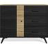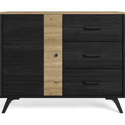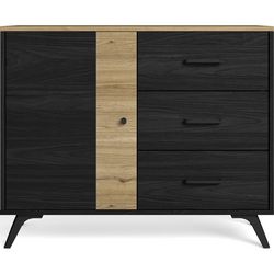 Buffet - Zack - Matière : panneaux de particules et mélamine issus de bois FSC - Couleur : effet bois naturel et effet chêne noir - Rangements : 1 porte, 1 tablette, 3 tiroirs - Dimensions des tiroirs : 44x30x21,5 cm - Poignées en métal noir - Piète
