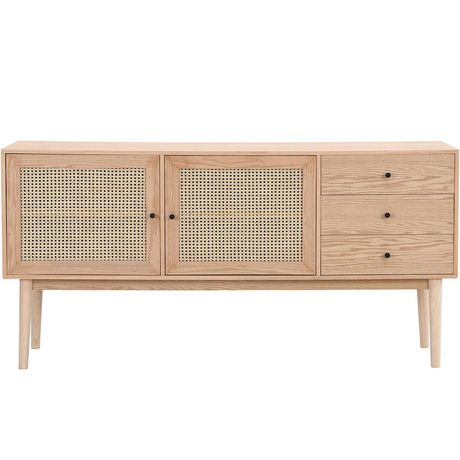 En savoir +- Buffet 2 portes et 3 tiroirs - Eden - Habillage en cannage naturel - Couleur : chêne naturel - Structure en panneau de particules avec placage chêne massif et cannage naturel - Fermeture avec système softclose - 2 portes, 2 tablettes, 3 tiroirs -