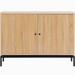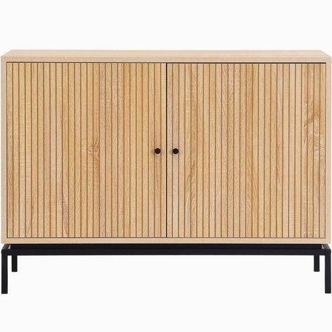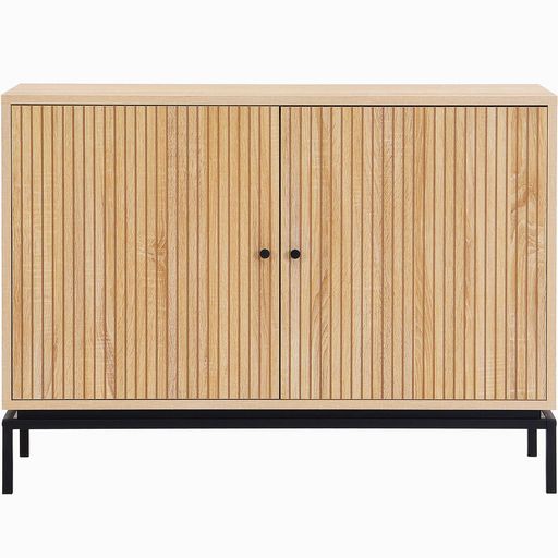 Buffet - Talia - Structure : panneaux de particules et mélamine - Couleur : effet bois - Rangements : 2 portes à fermeture douce et 2 tablettes - Piètement en métal noir - Hauteur 15 cm - Poignées en métal noir - Dimensions totales : 110 x 40 x 80 c