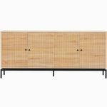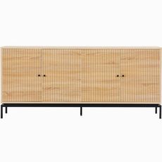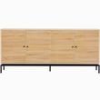 En savoir +Buffet - Talia - Structure : panneaux de particules et mélamine - Couleur : effet bois - Rangements : 4 portes à fermeture douce et 4 tablettes - Piètement en métal noir - Hauteur 15 cm - Poignées en métal noir - Dimensions totales : 180 x 40 x 80 c