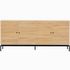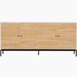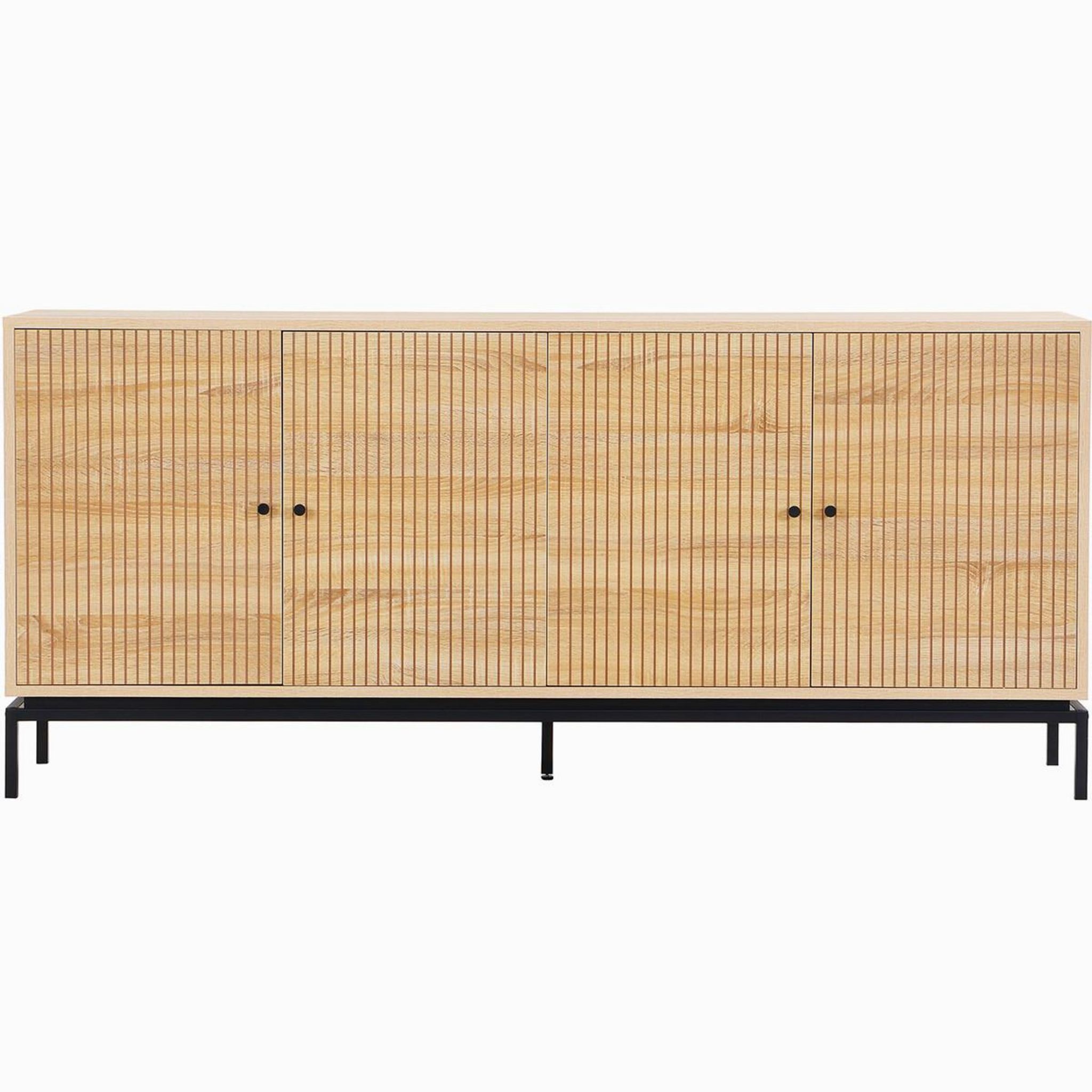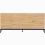 Buffet - Talia - Structure : panneaux de particules et mélamine - Couleur : effet bois - Rangements : 4 portes à fermeture douce et 4 tablettes - Piètement en métal noir - Hauteur 15 cm - Poignées en métal noir - Dimensions totales : 180 x 40 x 80 c