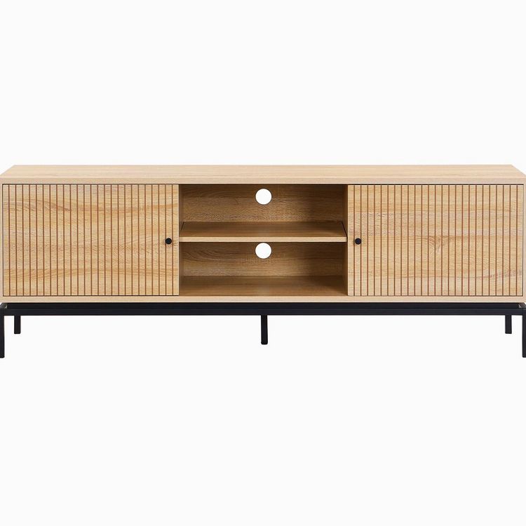 Meuble TV - Talia - Structure : panneaux de particules et mélamine - Couleur : effet bois - Rangements : 2 niches et 2 portes à fermeture douce - Passe-câble inclus - Piètement en métal noir - Hauteur 15 cm - Poignées en métal noir - Dimensions tot