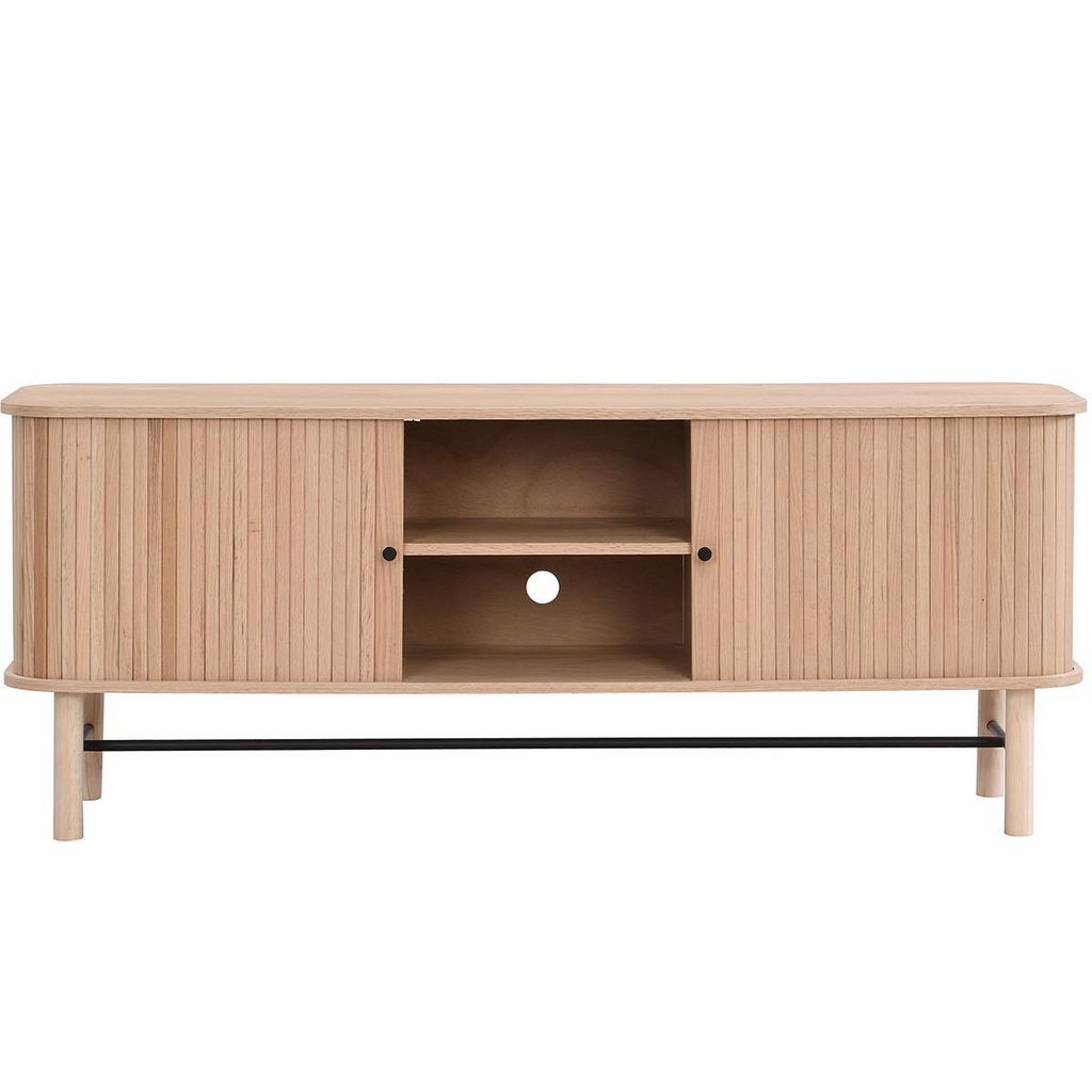 - Meuble TV avec portes coulissantes - Lino - Couleur : chêne naturel - Structure en panneau de particules avec placage chêne massif - Fermeture avec système softclose - 2 niches, 2 portes abattantes, 2 tablettes - Piètement en bois massif, hauteur