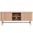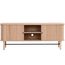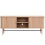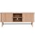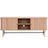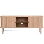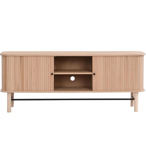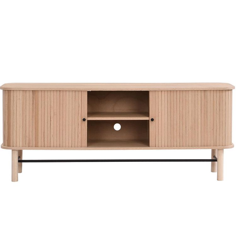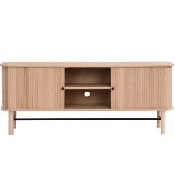 En savoir +- Meuble TV avec portes coulissantes - Lino - Couleur : chêne naturel - Structure en panneau de particules avec placage chêne massif - Fermeture avec système softclose - 2 niches, 2 portes abattantes, 2 tablettes - Piètement en bois massif, hauteur