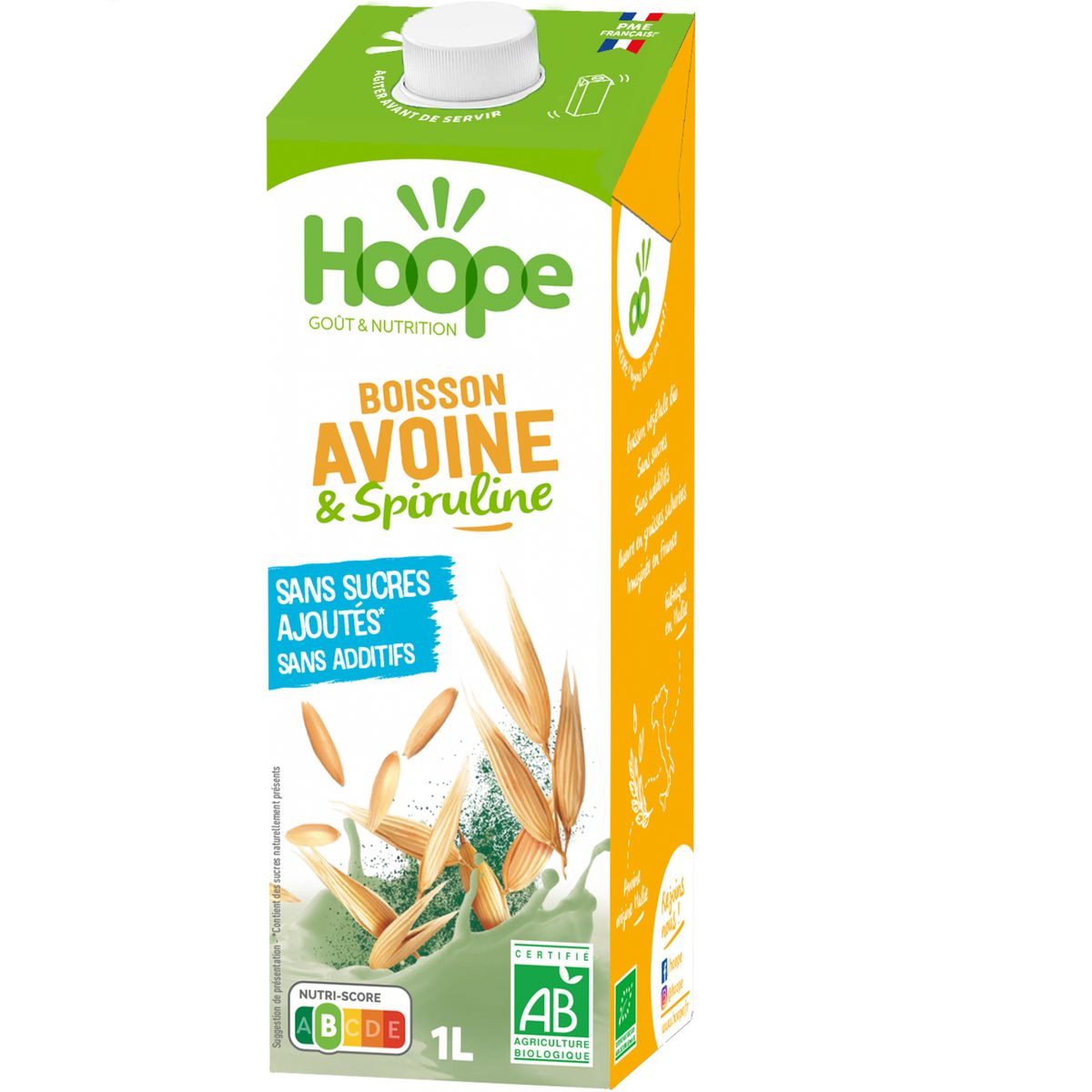 Ingrédients : Eau, Avoine* 13%, spiruline* 0,4%, huile de tournesol*, sel marin. *Ingrédients issus de l’agriculture biologique.