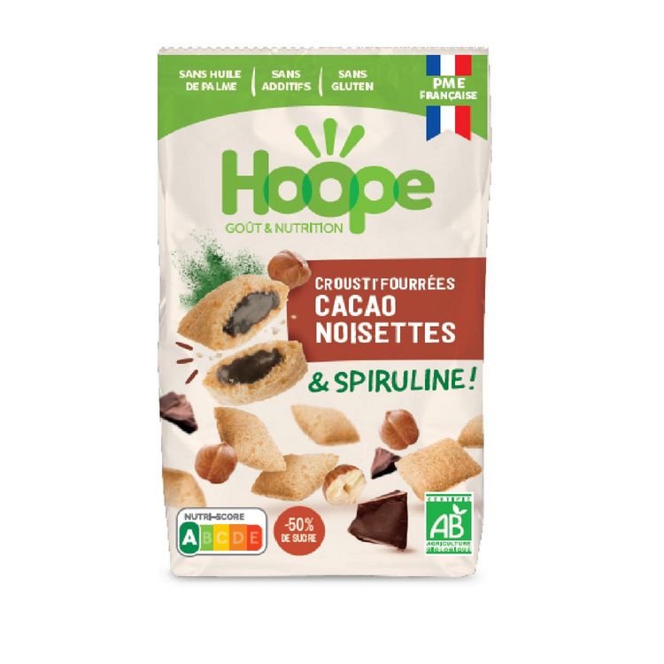 Ingrédients : Céréales* 59,8% (Farine de riz*, farine de riz complète*, farine de maïs*), fourrage* 35% (sucre de canne*, huile de colza*, noix de cajou* 16%, noisettes* 12,5%, cacao en poudre*°10,5%, spiruline* 4%, farine de lin déshuilée*), sucre de canne*, farine de lin déshuilée*. *Ingrédients issus de l’Agriculture Biologique. °Ingrédient issu du commerce équitable.