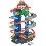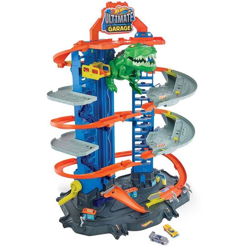Méfiez-vous du T-Rex Robot affamé qui ne cherche qu’une chose : croquer les véhicules Hot Wheels. Dévalez à toute vitesse la double piste qui s’élance du haut de la tour du parking pour une course effrénée et des méga sauts.
