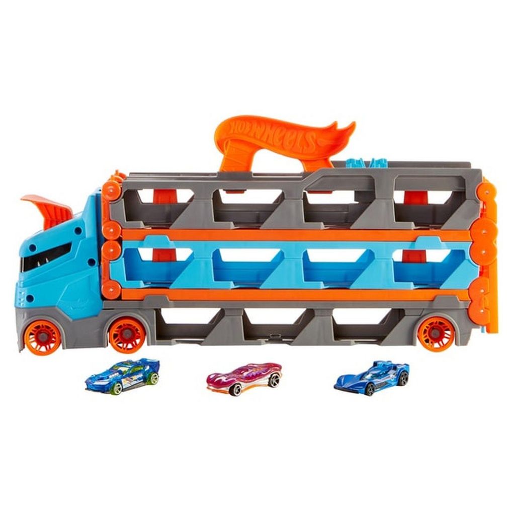 [Cet avis a été recueilli en réponse à une offre.] Mon fils de 5 ans raffole de ce camion transporteur de voitures qui se transforme en circuit afin de propulser les voitures . Il se déploie pour former une grande piste de course . Il dispose d'un bouton pressoir afin d'envoyer les voitures sur la piste , il y a 3 voitures incluses dans le pack . Il est compatible avec d'autres coffrets Hot Wheels que nous prendrons pour notre fils a Noël . Comme les coffrets de voitures car le transporteur peut en contenir 20 . Mon fils joue beaucoup avec son grand frère de 9 ans , ce camion transporteur amusera donc les enfants de tous âges .