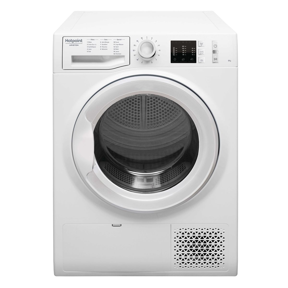 Hotpoint vous propose ce sèche linge d'une capacité de 8 Kg, il fonctionne avec un système de séchage par condensation et propose pas moins de 15 programmes avec entre autres les classiques coton ou délicat mais aussi certains plus spécifiques comme le programme laine ou encore chemise.