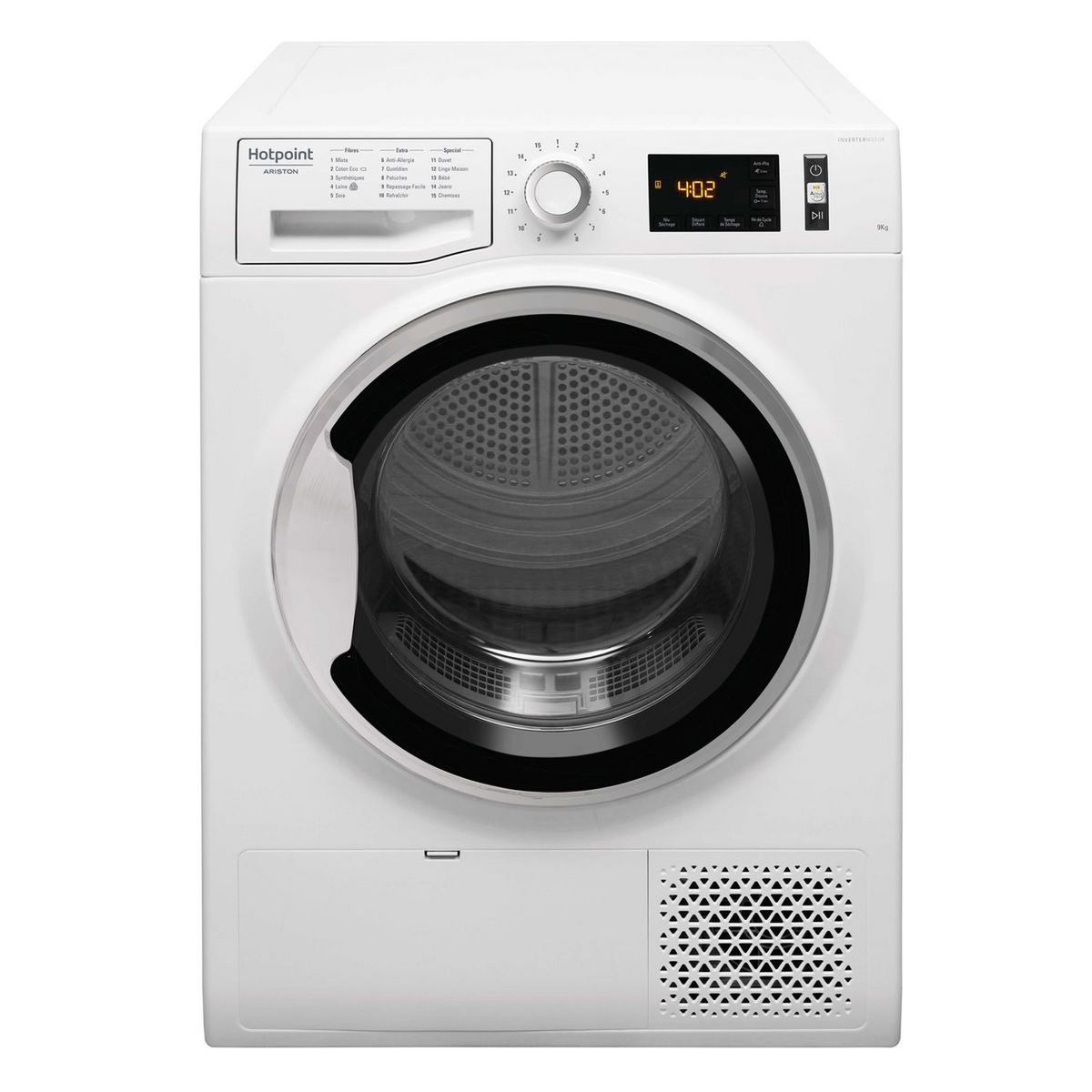 Choisissez le programme adéquat pour votre linge, tels que coton, synthétique ou soie, grâce à l’écran et le bouton rotatif de ce sèche linge.