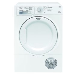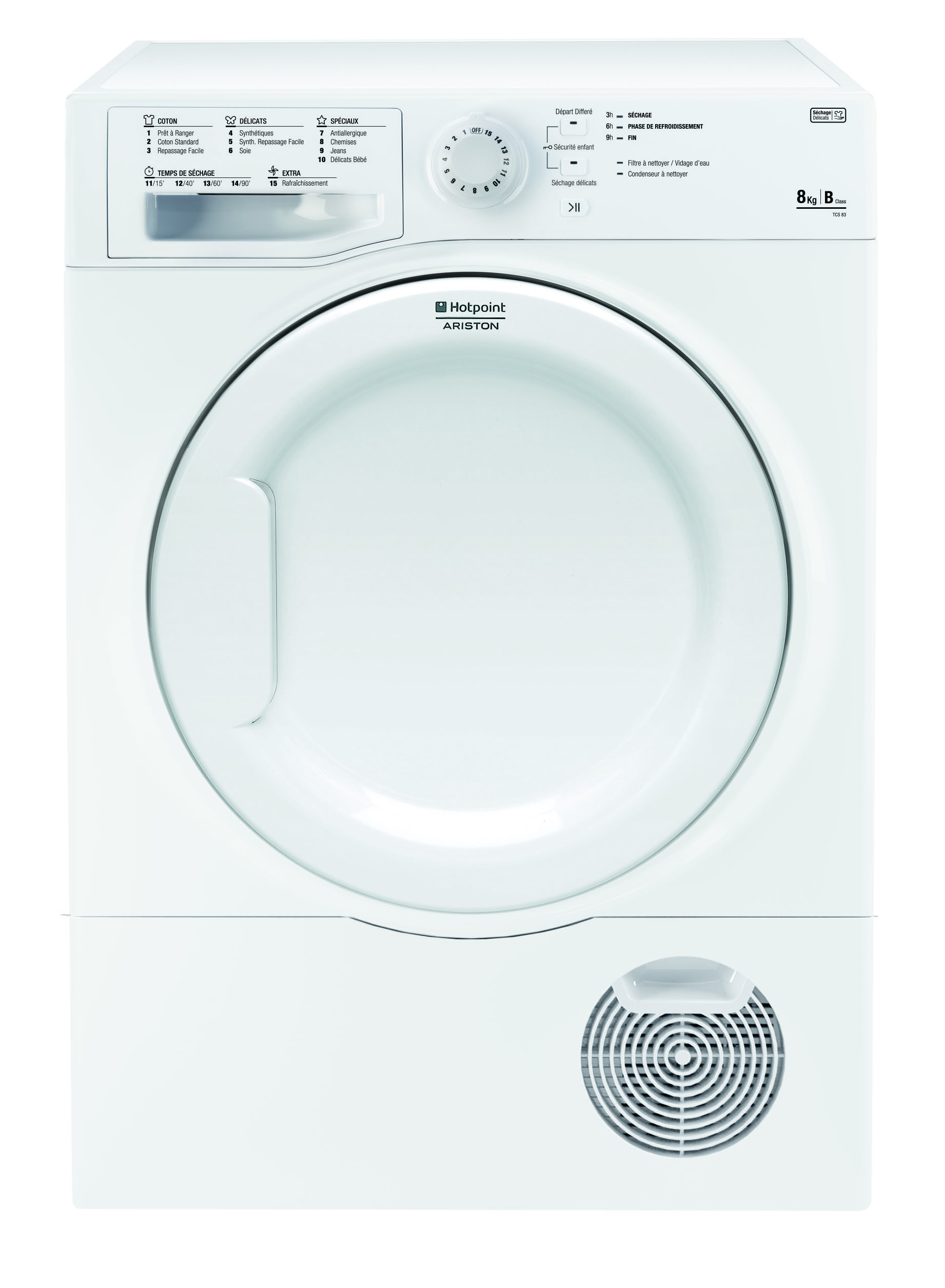 Ce sèche-linge à condensation de la marque Hotpoint a une capacité de séchage de 8 Kg.