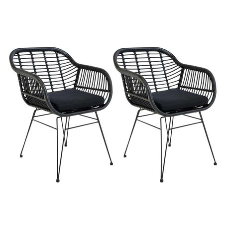 Ces fauteuils en bois avec pieds en acier s'intégreront parfaitement sur votre terrasse ou dans votre salle à manger ! Ce sont des fauteuils de jardin durables et résistants, complètement adaptés à un usage extérieur. Ils peuvent être utilisés comme chaises de salle à manger, ou comme fauteuils d'appoint. Leur couleur noir ajoutera une touche moderne à votre décoration ! Disponibles en coloris naturel. Dimensions : longueur 60 cm / Hauteur 82 cm / Largeur 57 cm. Hauteur d'assise : 43 cm. Profondeur d'assise : 41. Matière : Acier, polyrotin. Poids : 6,3 kg. Livrés démontés, faciles à assembler. Quantité : 4 fauteuils.