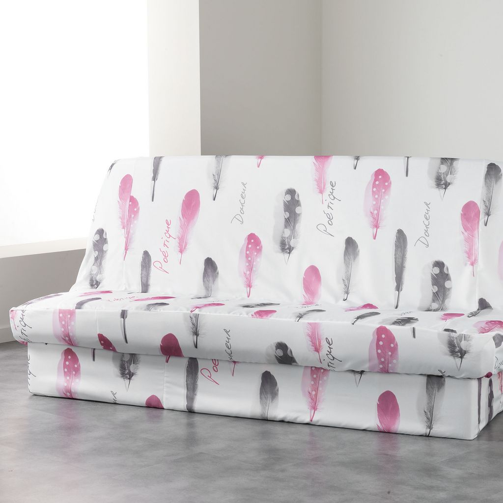 Motif ravissant, couleurs douces et raffinées... une housse pour clic-clac "pur charme", jolie façon de donner un coup de neuf à votre banquette (et à toute votre pièce !) à peu de frais. Une housse facile à poser, livrée avec sa bande-socle, à s'offrir sans hésiter avec les coussins "plumes" coordo