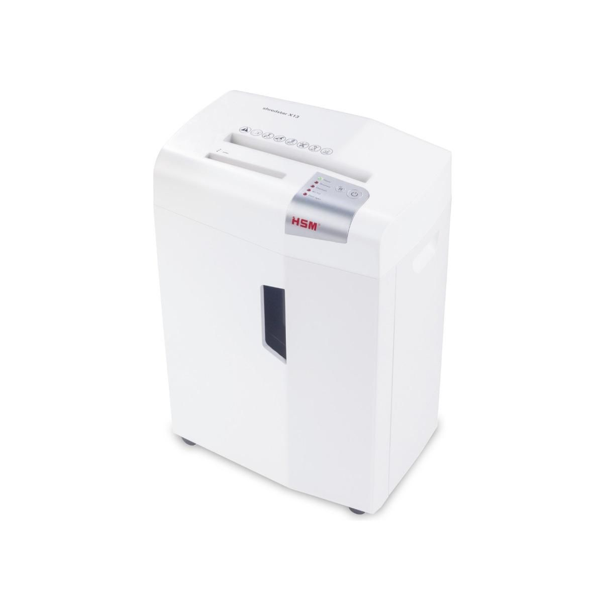 Hsm 1057121 Destructeur de documents shredstar X13 1057121 de HSM convivial et fonctionnel. Ce destructeur de documents monté sur roulettes au design moderne avec système de coupe en particules, dispose d'une fonction anti-bourrage. Convient pour un usage partagé jusqu'à 5 utilisateurs. Le système de cylindres séparé pour CD permet de détruire facilement des CD et DVD, des cartes de crédit et cartes de fidélité. Grâce au système de cylindres séparé pour CD, les matériaux détruits sont séparés et peuvent être ainsi éliminés dans le respect d'un tri homogène par matières. La machine s'éteindra automatiquement s'il est indiqué sur l'écran que la corbeille est pleine. Le collecteur s'enlève et se vide facilement. Le retour automatique évite les bourrages et assure un fonctionnement sans incident. Le mode de fonctionnement silencieux réduit le niveau sonore sur le lieu de travail. Une cellule photoélectrique intégrée démarre automatiquement l'appareil lorsque vous introduisez un document et l'éteint une fois que celui-ci est détruit. Le témoin LED indique l'état de fonctionnement de l'appareil : allumé, surcharge, surchauffe, corbeille pleine, porte ouverte. Le niveau de remplissage peut à tout moment être contrôlé à travers la fenêtre de visualisation. Le destructeur de documents peut être facilement déplacé car il est monté sur roulettes.