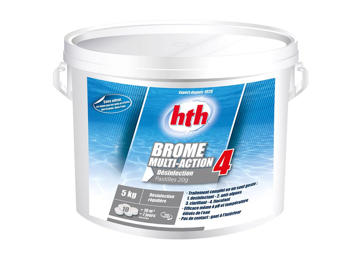 Brome multifonction Action4 HTH 5Kg en pastille de 20 g. Idéal pour les eaux chaudes (piscines privées et spas).4 actions : désinfectant, anti-algues, clarifiant et floculant.