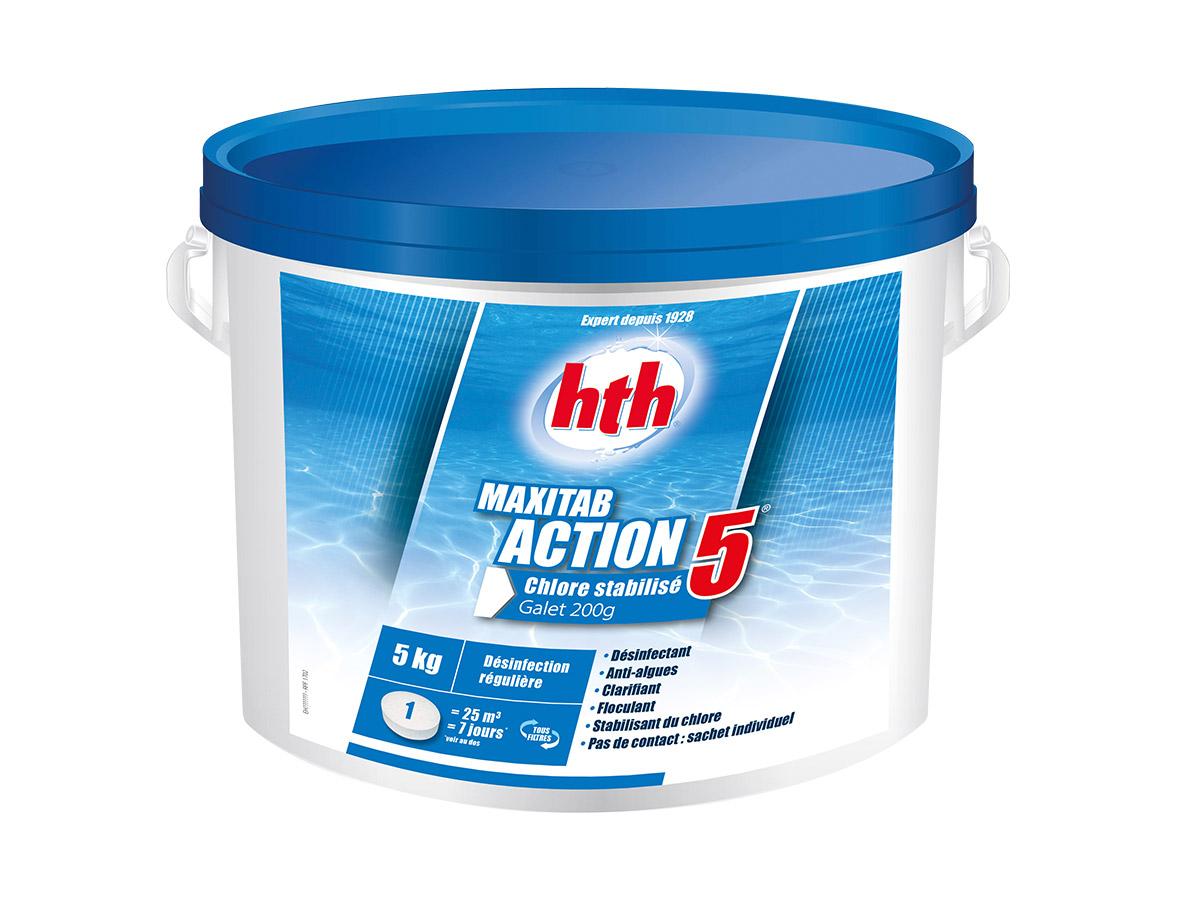En savoir +Le chlore 5 actions Maxitab 5 kg de la marque HTH assure un traitement de l'eau au chlore pour une piscine saine.