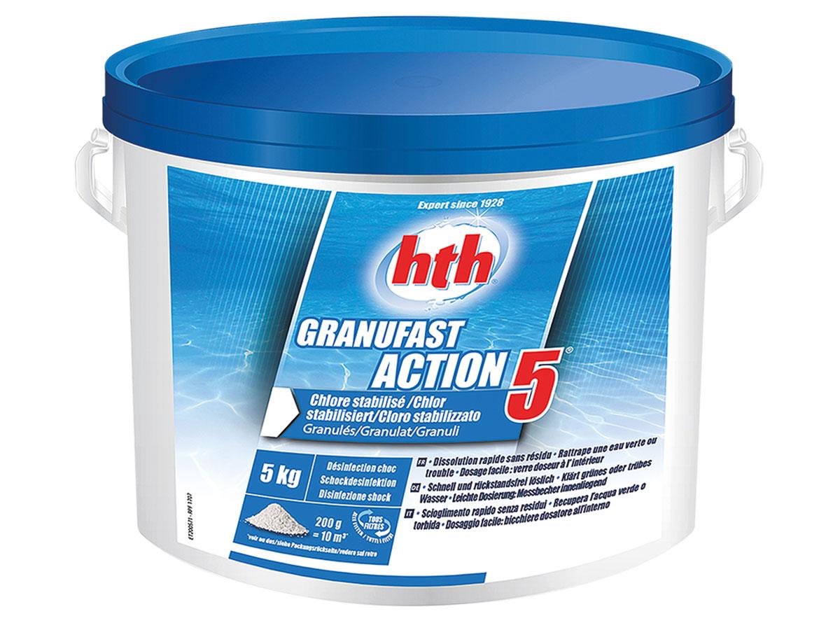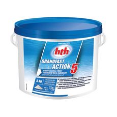 Chlore choc multifonction Granufast 5 actions 5 kg - HTHRattrape une eau verte ou troubleGranulé à dissolution rapide, sans résiduAction désinfectanteNon-comburant au transport, au stockage et à la manipulationStabilisation élevée contre l'action destructrice des rayons ultra-violets de la lumière s
