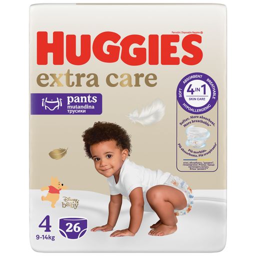 Huggies Extra Care est la gamme spécialement conçue pour la protection de la peau délicate des bébés avec ses bénéfices 4 en 1 : matériaux doux, absorbants, respirants et hypoallergéniques