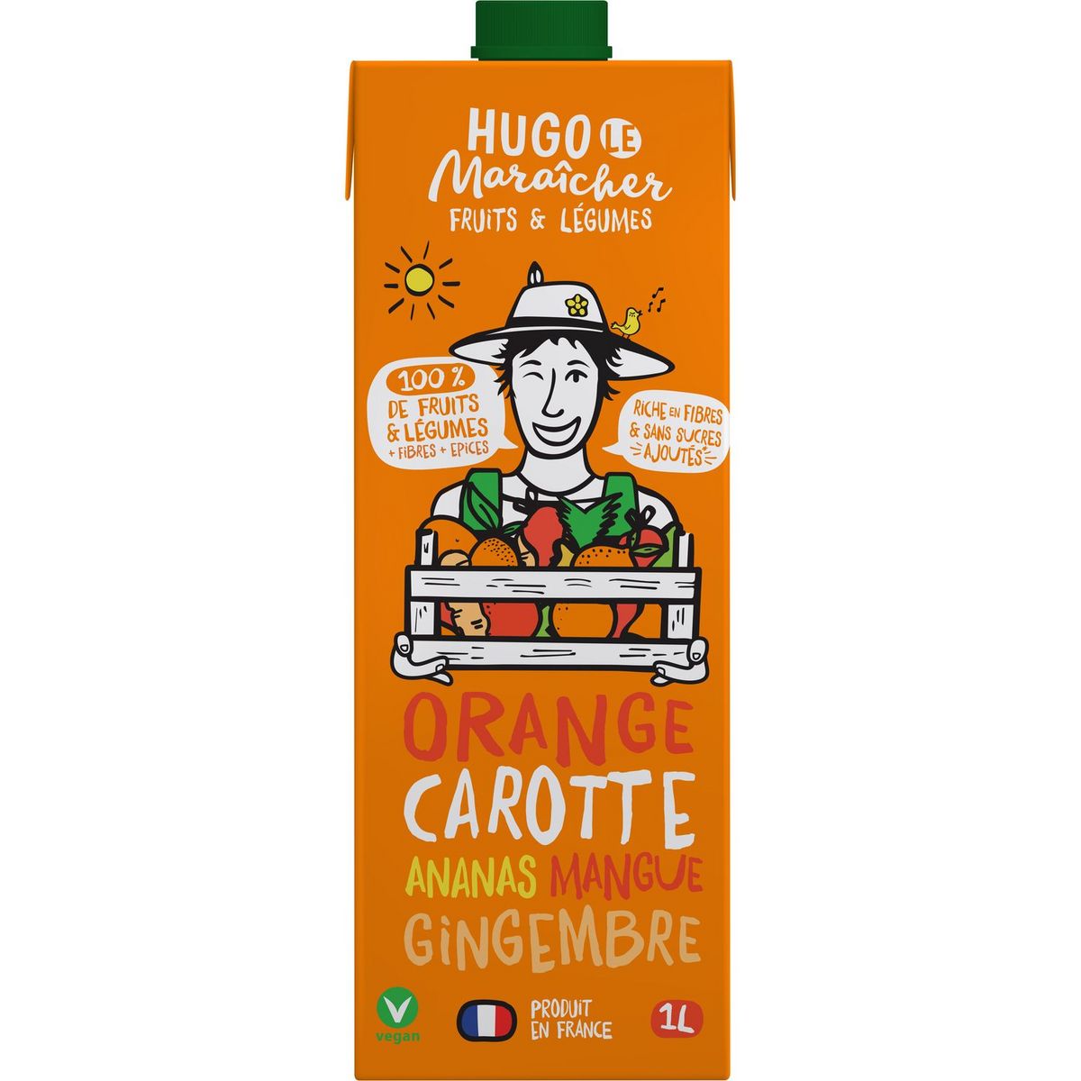 Ingrédients : Jus d'orange (31%), jus de carotte (24%), purée de pomme, jus d'ananas (14%), purée de mangue (8%), jus de citron vert (3%), fibres d'acacia, gingembre en poudre (0,2%).
