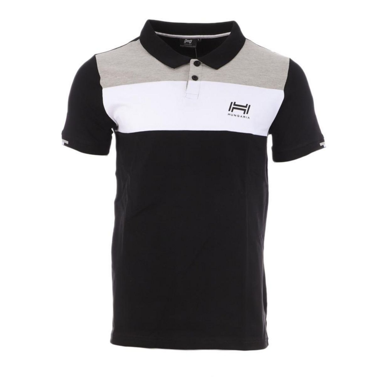 Polo homme de la marque Hungaria ! Couleurs : Noir/Gris/Blanc Coupe altique Col boutonné Manches courtes Logo Hungaria thermocollé Composition : 48% coton, 47% polyester, 5% élasthanne