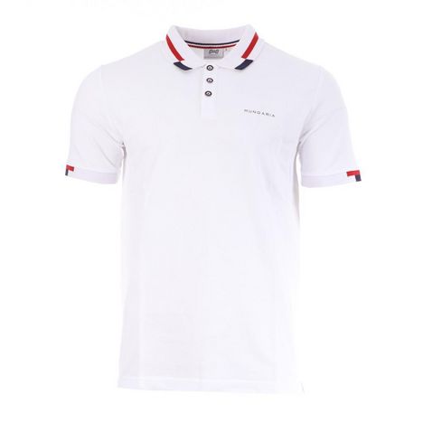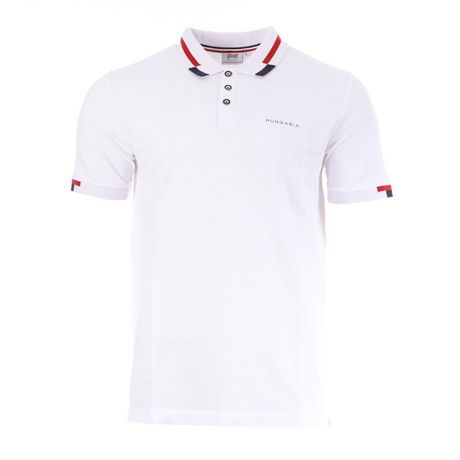 Optez pour ce polo homme de la marque Hungaria ! Couleur : Blanc Coupe altique Manches courtes Col à trois boutons Composition : 98% coton, 2% élasthanne
