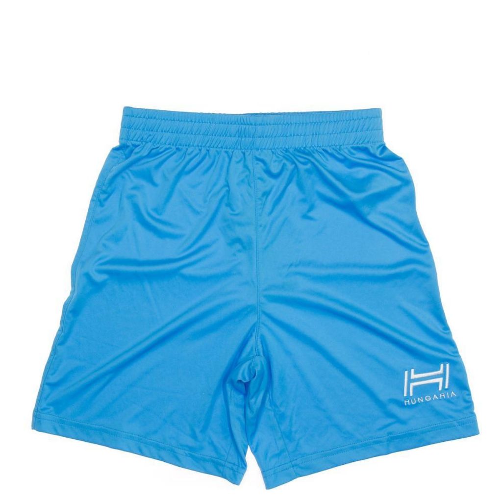 Short bleu ciel pour garçon de la marque Hungaria ! Ceinture élastique avec cordon de serrage Logo Hungaria brodé en blanc sur la cuisse gauche Composition : 100% polyester