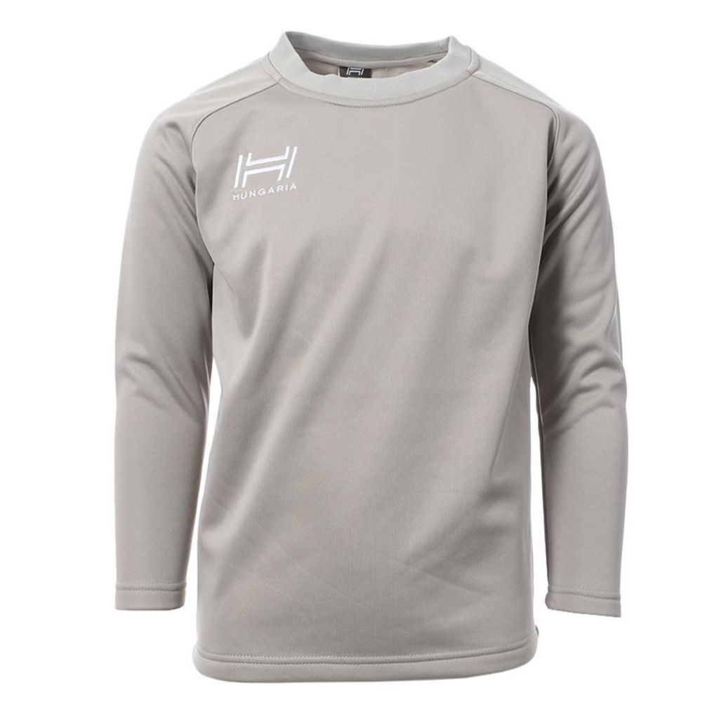 Sweat d'entrainement gris pour enfant de la marque Hungaria. Idéal pour rester au chaud ! Manches longues Col rond Logo Hungaria brodé en blanc sur la poitrine et la manche gauche Coloris intégralement gris Composition : 100% polyester