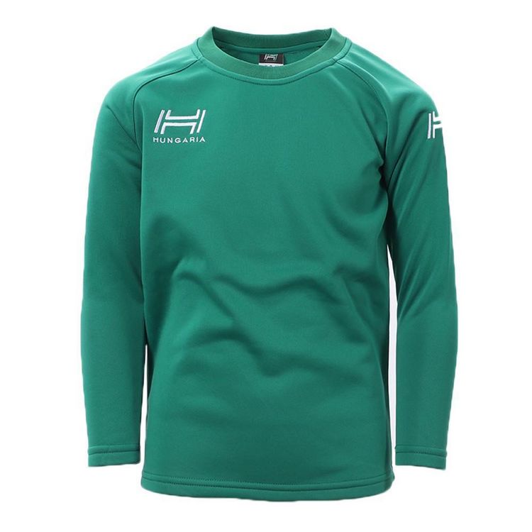 Sweat d'entrainement vert pour enfant de la marque Hungaria. Idéal pour rester au chaud quand il fait froid ! Manches longues Col rond Logo Hungaria brodé en blanc sur la poitrine Coloris intégralement vert Composition : 100% polyester
