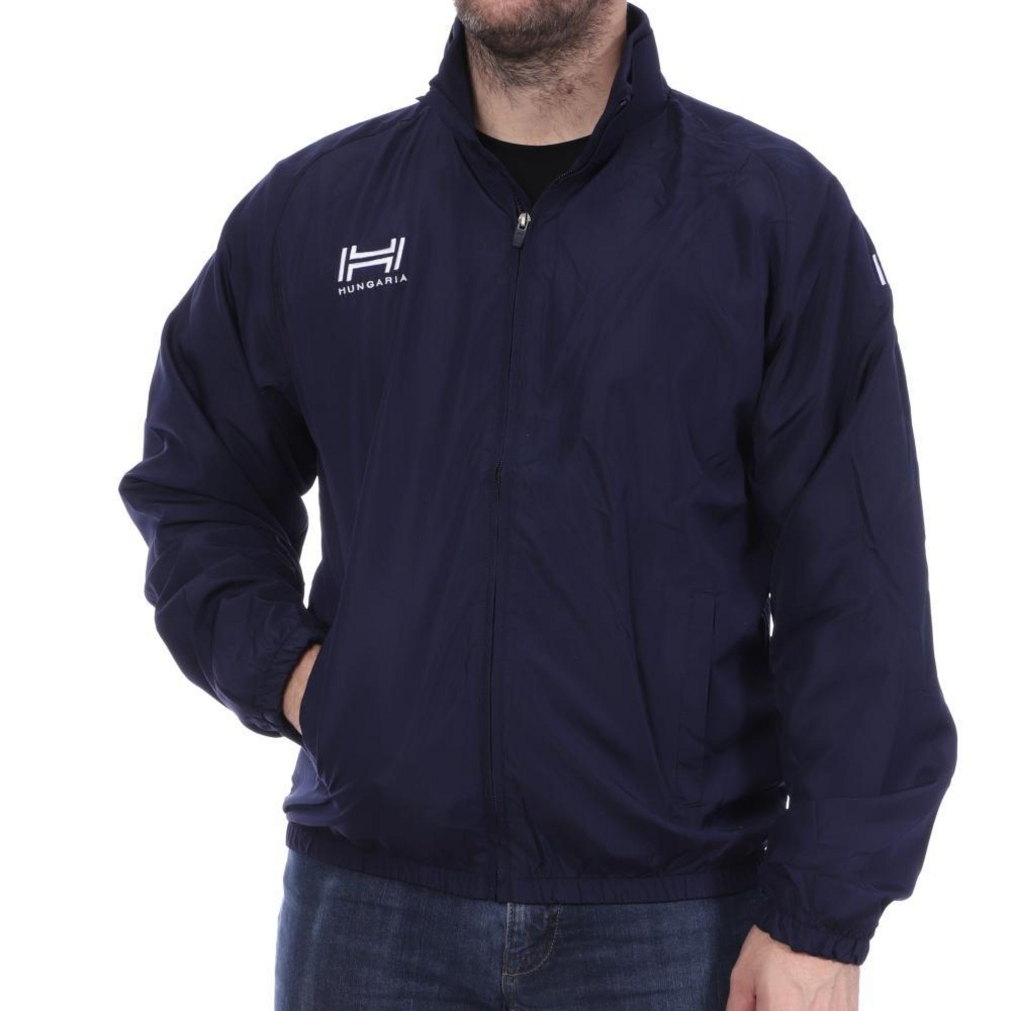 En savoir +Veste pour homme de la marque Hungaria Col montant Zip intégral poches latérales ouvertes Poignets et bas du corps élastique Intérieur filet Logo sur la poitrine et l'épaule 100% polyester