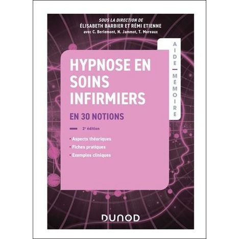 L'hypnose est maintenant une approche validée scientifiquement dans le domaine des soins, et son développement est important du fait de ses avantages cliniques. Cet ouvrage écrit par des infirmiers hypnopraticiens expérimentés est inédit en son genre. Il propose de traiter spécifiquement des applications de l'hypnose dans les soins infirmiers et en accompagnement des actes médicaux de manière pratique et accessible. Il s'articule autour de trois axes : - des aspects théoriques : étapes d'une séance d'hypnose, - construction des métaphores, hypnose conversationnelle... - des fiches pratiques détaillées : soins infirmiers et actes médicaux courants et plus spécifiques des conseils généraux et organisationnels : formations, législation, installation de l'hypnose à l'hôpital... Enrichi de nombreux exemples, cas cliniques et références scientifiques, cet aide-mémoire accompagnera tout professionnel dans sa pratique quotidienne.