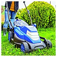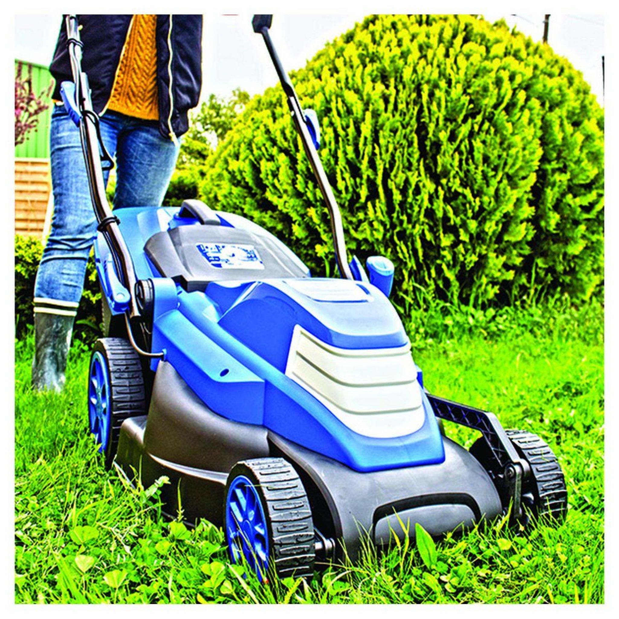 En savoir +Cette tondeuse électrique 1600W de la marque Hyundai dispose de 5 hauteurs de coupe entre 25 et 75 mm, d'une largeur de coupe de 38 cm et d'un bac de ramassage de 40L.