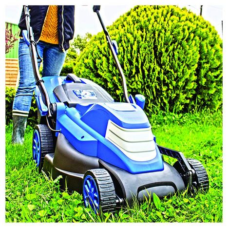 Cette tondeuse électrique 1600W de la marque Hyundai dispose de 5 hauteurs de coupe entre 25 et 75 mm, d'une largeur de coupe de 38 cm et d'un bac de ramassage de 40L.