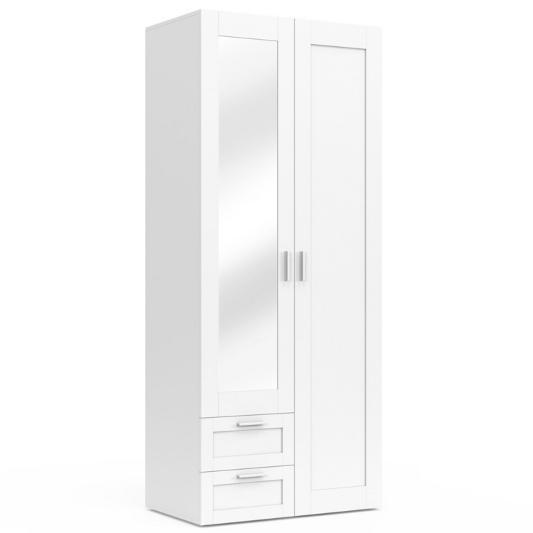 Armoire 2 portes VITO blanc penderie 80 cm avec 2 tiroirs, miroir et étagères