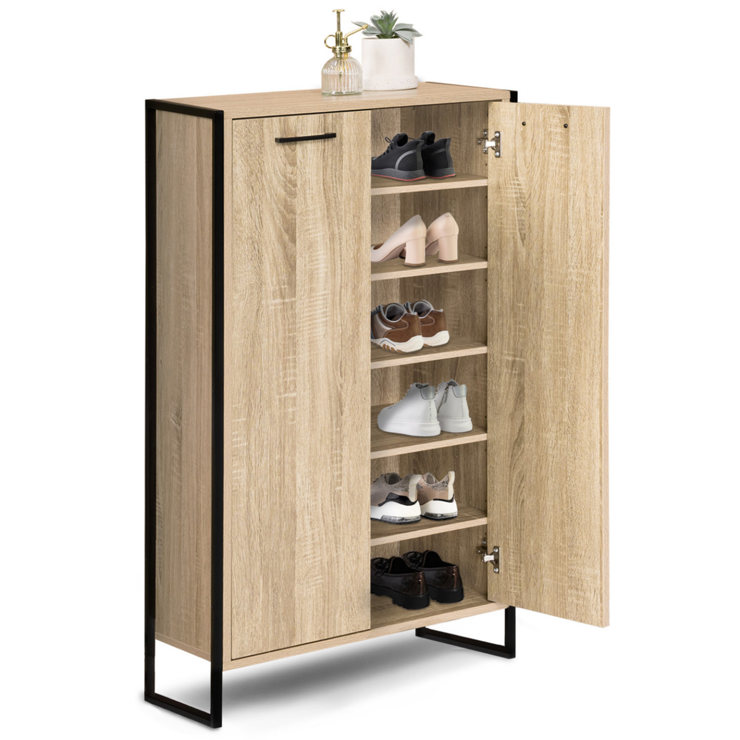 Avec sa capacité jusqu'à 18 paires de chaussures (3 paires par étagères), toute la famille trouvera une place de rangement pour garder ses chaussures à l'abri de la poussière ! Les jolies poignées intégrées ainsi que la structure en métal noir apportent design, robustesse et stabilité au meuble.Doté de 5 étagères ajustables, organisez votre rangement comme bon vous semble. Bi-matière bois façon hêtre et métal noir, ce meuble à chaussures esprit factory fera de votre vestibule un espace accueillant et bien rangé ! Ses finitions soignées vous donnent la possibilité de le ranger dans une buanderie, un dressing, ou même une entrée !Vous n'avez plus qu'a poser de jolis objets décoratifs ou de petites plantes vertes sur le dessus du meuble.Avec sa profondeur de 35 cm et son design tout en hauteur, il vous fera gagner de la place et n'encombrera pas votre pièce !Son format légèrement surélevé est idéal pour nettoyer sous le meuble.Ne laissez plus traîner vos paires de chaussures et gardez-les à l'abri des regards dans ce meuble de rangement moderne et discret !Dimensions du meuble chaussures LUIS 2 portes design industrielDimensions globales : Longueur 60 cm x largueur 35 cm x Hauteur 110 cmDimensions intérieures d'une étagère : L. 53.5 x l. 33 x H. 15 cmHauteur des pieds : 10 cm5 étagères ajustablesMatériaux : Panneaux de particules de bois 15 mm / métal 16 mmColoris : bois et noirCapacité : 18 paires de chaussuresÀ fixer au mur pour éviter tout risque de basculementÀ monter soi-mêmeRetrouvez l'ensemble de notre collection industrielle sur notre site internet et tous nos meubles à chaussures !