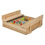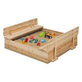 Offrez à vos enfants un espace de jeux en plein air comme à la plage avec ce bac à sable de 100 x 100 cm et ses 2 grands bancs intégrés !Celui-ci deviendra rapidement l'endroit préféré de vos enfants, et les encouragera à jouer dehors dès que les beaux jours feront leur apparition !Avec ses larges dimensions de L.100 x l.100 x H.20 à 37 cm, vos enfants pourront profiter d'un grand espace rien qu'à eux pour développer leur imagination en construisant de grands châteaux de sable avec leurs amis et jouer comme s'ils étaient à la plage !Composé de 2 grands bancs, le bac à sable a été pensé afin que vos enfants puissent s'y asseoir pendant qu'ils jouent. Pratique, les bancs se plient à votre guise et vous permet de protéger l'intérieur du bac à sable lorsque les enfants ont fini de jouer. Astuce : le bois du bac est naturel. Nous vous recommandons de poser une lasure de protection pour garantir la durabilité du produit.Ce bac à sable est simple et rapide à assembler et résistant aux intempéries.Il est fourni avec une bâche de sol afin d'éviter que les mauvaises herbes poussent ainsi qu'une bâche de protection pour le protéger au maximum du mauvais temps quand il ne sert pas.Alors laissez-vous tenter et offrez à vos enfants des moments d'amusement et de joie comme à la plage, depuis votre jardin !Dimensions du bac à sable avec refermable bancsDimensions globales dépliées : Longueur 100 cm x largeur 100 cm x Hauteur 37 cmDimensions globales pliées : L. 100 x l. 100 x H. 20 cmMatériaux : Structure en bois, bâche de fond en tissu, bâche de protection en plastiqueColoris : bois naturelÉpaisseur de la structure : 1,5 cmDimensions des bancs : L. 100 x l. 16 x H. 15,5 cmBâches de fond et de protection inclusesCertifications : EN71-1 / EN71-2 / EN71-3À monter soi-mêmeDécouvrez également tous nos jeux d'extérieur sur notre boutique en ligne !