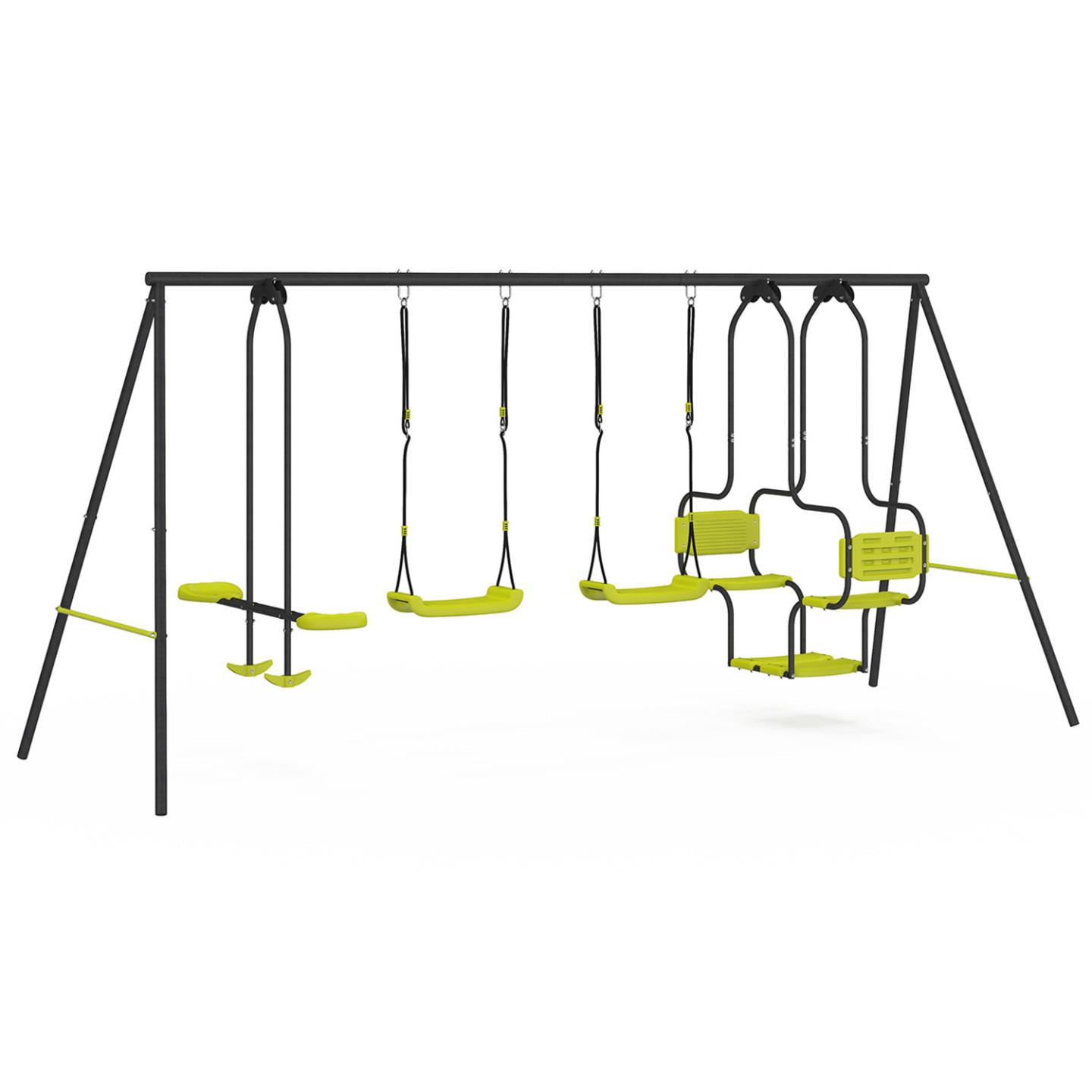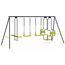 En savoir +Retrouvez toutes les sensations de la balançoire 4 agrès et partagez-les avec toute votre famille ! Cet ensemble comprend 2 balançoires simples ainsi qu'une nacelle et une balançoire face à face offrant à vos enfants une variété d'options de jeu pour s'amuser et prendre l'air. Aménagez un espace de jeu sécurisé et amusant en plein air avec cet ensemble gris et vert pomme qui se fondra à merveille dans votre jardin !Sa structure en acier thermolaqué ainsi que ses sièges arrondis en plastique sont conçus pour résister à toutes les intempéries. Ses pieds de 4,5 cm de diamètre en acier ainsi que ses 4 ancres à sceller dans le sol garantiront stabilité et robustesse à la balançoire pendant vos moments d'amusement en famille. N'hésitez plus et craquez pour la balançoire 4 agrès et offrez-vous des moments de divertissement en famille ! Dimensions de la balançoire 4 agrès portique 2 balançoires, 1 nacelle et 1 face à faceDimensions globales : Longueur 380 cm x largeur 170 cm x Hauteur 190 cmBarre transversale : Ø 5 cm - épaisseur d'acier 0,2 cmStructure des pieds : Ø 4,5 cm - épaisseur d'acier 0,1 cmMatériaux : Structure en acier thermolaqué et jeux en plastiqueInclus : 2 balançoires simples, 1 nacelle 2 places et 1 balançoire face à face 2 places avec repose-piedsCharge supportée : 50 kg par siègeColoris : Structure grise et jeux verts pommeÀ monter soi-mêmeVisserie incluseAttention. Ce portique est destiné aux enfants de 3 à 12 ans, d'un poids maximum de 50 kg. Son utilisation doit se faire sous la surveillance d'un adulte.Attention. Ce produit est destiné uniquement à un usage familial en extérieur. Il ne peut en aucun cas être utilisé pour les collectivités : écoles, campings, hôtels, lieux publics etc.Découvrez l'ensemble de nos jeux extérieurs et de plein air sur notre boutique en ligne !