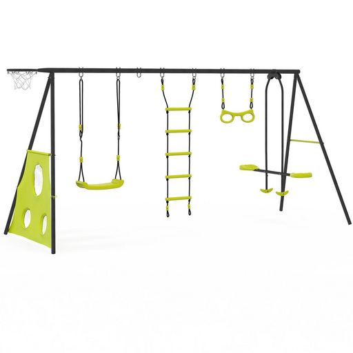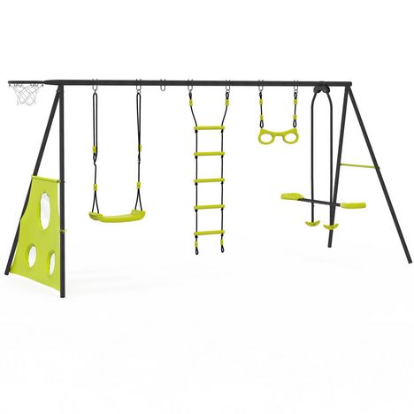 Retrouvez toutes les sensations de la balançoire 4 agrès et partagez-les avec toute votre famille ! Cet ensemble comprend 1 balançoire simple ainsi qu'une balançoire face à face, une échelle et un trapèze offrant à vos enfants une variété d'options de jeu pour s'amuser et prendre l'air. Composée également de buts de foot et d'un panier de basket, cette balançoire vous offre un panel d'activités pour toute la famille. Vous pourrez ainsi profiter d'après-midi ludiques et sportives avec vos enfants. Aménagez un espace de jeu sécurisé et amusant en plein air avec cet ensemble vert pomme et gris qui se fondra à merveille dans votre jardin ! Sa structure en acier thermolaqué ainsi que ses sièges arrondis en plastique sont conçus pour résister à toutes les intempéries. Ses pieds de 4,5 cm de diamètre en acier ainsi que ses 4 ancres à sceller dans le sol vous garantiront stabilité et robustesse pendant vos moments d'amusement en famille. N'hésitez plus et craquez pour la balançoire 4 agrès et offrez-vous des moments de divertissement en famille ! Dimensions de la balançoire 4 agrès portique avec balançoire face à face trapèze échelle panier de basket et buts de footDimensions globales : Longueur 383 cm x largeur 170 cm x Hauteur 190 cmBarre transversale : Ø50mm épaisseur d'acier 2mmStructure des pieds : Ø45mm épaisseur d'acier 1mmMatériaux : Acier thermolaqué et plastiqueColoris : Structure grise et jeux plastique vertsInclus : 1 balançoire simple, 1 trapèze, 1 échelle, 1 balançoire face à face, 1 panier de basket, 1 cible de tennisPoids maximal 50 kg par siègeÀ monter soi-mêmeAttention. Ce portique est destiné aux enfants de 3 à 12 ans, d'un poids maximum de 50 kg. Son utilisation doit se faire sous la surveillance d'un adulte.Attention. Ce produit est destiné uniquement à un usage familial en extérieur. Il ne peut en aucun cas être utilisé pour les collectivités : écoles, campings, hôtels, lieux publics etc.Découvrez l'ensemble de nos jeux extérieurs et de plein air sur notre boutique en ligne !