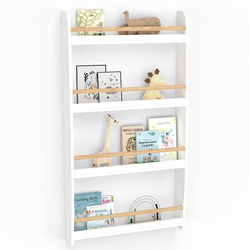 Vous rêvez d'une chambre toujours bien rangée pour votre enfant ? Craquez pour la bibliothèque murale PAULETTE blanc et bois et mettez toutes les chances de votre côté ! Avec son design moderne et épuré, cette bibliothèque murale est parfaite pour organiser l'univers de votre enfant tout en optimisant l'espace. Ce beau meuble de rangement pour enfant blanc et bois offre une grande capacité de rangement à petit prix, avec ses 4 étagères pour conserver une chambre bien ordonnée.Grâce à ses 4 étagères horizontales blanches et leur barre anti-chute en bois, les livres sont maintenus sans risque de tomber. Votre enfant peut ainsi voir toutes ses histoires en un clin d'œil, ce qui l'incite à lire et à choisir ses livres seul. Les différentes histoires, dessins ou petits jouets trouveront aisément leur place sur ces 4 étagères. Pratique, la structure murale permet de garder le sol dégagé : idéale pour les chambres d'enfant ou les salles de jeux. Vous pourrez la fixer au mur à la hauteur souhaitée permettant à votre enfant d'avoir facilement les histoires à portée de main et de ranger lui-même ses livres. Sa fixation murale garantit également la sécurité de votre enfant et évite le basculement du meuble. Facile à installer, cette étagère murale évoluera au fil des années avec votre enfant.Epurée et élégante, la bibliothèque murale PAULETTE blanc et bois s'intègre parfaitement à la décoration d'une chambre d'enfant, qu'importe l'âge ou le sexe.Choisissez la bibliothèque murale PAULETTE pour que votre enfant ait toujours ses livres bien rangés !Pour la sécurité de vos enfants, cette bibliothèque est à fixer au mur et ne doit pas être escaladée. Dimensions de la bibliothèque murale PAULETTE 4 étagères blanc et boisDimensions globales : Longueur 60 cm x largeur 12 cm x Hauteur 110 cmHauteur entre chaque étagère : H. 30 cmRebord de 4 cm pour chaque étagèreMatériaux : panneaux de particules de bois (PB) et pinColoris : blanc / boisÂge recommandé : 3 ans et +À fixer au murÀ monter soi-même Retrouvez l'ensemble de notre mobilier pour enfant sur notre boutique en ligne !