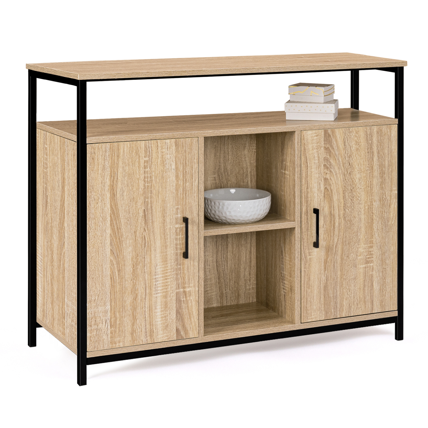 Egayez votre salle à manger avec ce buffet DETROIT design industriel bois et noir ! Doté de multiples rangements, il mettra en valeur vaisselle et objets déco tout en gardant votre intérieur bien ordonné !Bi-matière bois et métal, ce meuble au style industriel s'adaptera facilement à différentes pièces de la maison quel que soit votre intérieur grâce à ses coloris sobres bois et noir.Deux placards munis chacun d'une étagère vous offriront un espace de rangement fermé pour conserver votre vaisselle ou tout autre objet à l'abri de la poussière. Modulez les étagères selon vos besoins, en les réglant sur l'une des 3 positions possibles !Deux niches centrales ouvertes ainsi qu'une étagère supérieure ajoutent au buffet de nombreuses possibilités pour ranger vos affaires et exposer vos plus beaux objets !Avec ses multiples rangements, vous pourrez aussi faire de ce meuble une bibliothèque des plus tendance !Sa structure en panneaux de particules de bois 1,5 cm et tubes métal 1,6 x 1,6 cm lui assure stabilité et robustesse tout en participant à son look résolument factory.Optez pour le design industriel malin avec ce buffet DETROIT 2 portes et étagères !Dimensions du buffet DETROIT bi-matière bois et métalDimensions globales : Longueur 100 cm x largeur 30 cm x Hauteur 81 cmDimensions d'une niche : L. 28 x l. 30 cmHauteur entre chaque étagère : 26 cmDimensions d'un placard : L. 30 x l. 26 x H. 54 cmPlacard avec 1 étagère (3 positions possibles)Hauteur des pieds : 5 cmMatériaux : panneaux en particules de bois (PB) et métalÉpaisseur des plateaux particules de bois : 1,5 cmÉpaisseur des tubes en métal : 1,6 x 1,6 cmÀ monter soi-mêmeDécouvrez également notre buffet bas 2 portes DETROIT design industriel ainsi que l'ensemble de notre collection industrielle sur notre boutique en ligne !