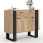 Vous recherchez un meuble à la fois tendance et pratique qui vous offre une maxi capacité de rangement ? Découvrez le buffet PHOENIX 100 cm 3 portes et 1 tiroir bois et noir qui donnera un esprit atelier à votre salle à manger !Doté de nombreux espaces de rangement, ce buffet aux dimensions généreuses (100 x 34 cm) est idéal pour une pièce de vie ordonnée. Ses 3 placards, vous permettront de ranger vaisselle, électroménager, vases ou même livres de cuisine et autres effets personnels à l'abri des regards.Quant à son grand tiroir de 92,5 cm de longueur, il sera idéal pour vos couverts, ustensiles de cuisine, sets de table ou pourquoi pas pour dissimuler quelques papiers, pour un intérieur net et rangé !Exposez objets déco, lampe ou encore petite plante verte sur son plateau supérieure !Ses pieds larges et sa structure à l'aspect massif assurent solidité et stabilité à ce buffet ultra design. La structure en panneaux de particules de ce buffet salle à manger enfilade est stable et robuste.L'association des coloris bois et noir lui donne un effet bi-matière et apportera modernité et tendance dans votre intérieur. Ses coloris naturels se fondront à merveille avec votre décoration pour une ambiance à la fois chaleureuse et moderne !Profitez de ce buffet de salon industriel bois et noir à prix irrésistible ! Dimensions du buffet PHOENIX 100 cm 3 portes 1 tiroirDimensions globales : Longueur 100 cm x largeur 34 cm x Hauteur 80 cmHauteur des pieds : 20 cm Dimensions de la façade des tiroirs : L. 97 x H. 16 cm Dimensions intérieures du tiroir : L. 92,5 x l. 24 x H. 8,5 cm Dimensions intérieures de la double porte : L. 64 x l. 30 x H. 43 cm Dimensions intérieures de la porte de placard simple : L. 32 x l. 30 x H. 43 cm Matériaux : Panneau de particules de bois (PB)À monter soi-même