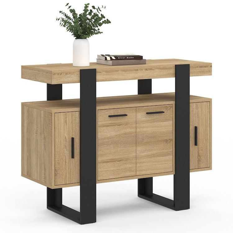 Vous recherchez un meuble à la fois tendance et pratique qui vous offre une maxi capacité de rangement ? Découvrez le buffet PHOENIX 100 cm 4 portes bois et noir qui donnera un esprit atelier à votre salle à manger !Doté de nombreux espaces de rangement, ce buffet aux dimensions généreuses (100 x 40 cm) est idéal pour une pièce de vie ordonnée. Ses 4 placards, vous permettront de ranger vaisselle, électroménager, vases ou même livres de cuisine et autres effets personnels à l'abri des regards.Exposez objets déco, lampe ou encore petite plante verte sur son étagère supérieure !Ses pieds larges et sa structure à l'aspect massif assurent solidité et stabilité à ce buffet ultra design.L'association des coloris bois et noir lui donne un effet bi-matière et apportera modernité et tendance dans votre intérieur. Ses coloris naturels se fondront à merveille avec votre décoration pour une ambiance à la fois chaleureuse et moderne !Profitez de ce buffet industriel bois et noir à prix irrésistible ! Dimensions du buffet PHOENIX 4 portesDimensions globales : Longueur 100 cm x largeur 40 cm x Hauteur 80 cmDimensions placards centraux : L. 25 x l. 35 x H. 37 cm (avec étagère au milieu)Dimensions placards latéraux : L. 29 x l. 35 x H. 37 cmLargeur des portes latérales : 19,5 cmHauteur de la niche entre l'étagère et la partie basse : 13 cmHauteur du rebord de l'étagère : 7 cmDimensions de chaque pied : l. 9 x H. 20 cmEpaisseur des plateaux en particules de bois : 1,5 cmÀ monter soi-mêmeRetrouvez l'ensemble de nos buffets ainsi que notre collection PHOENIX sur notre boutique en ligne !