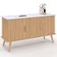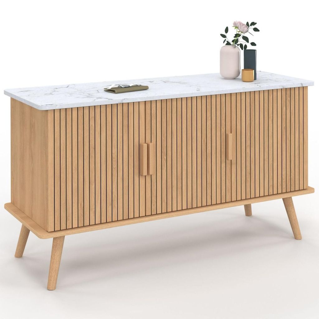 Buffet 110 cm JULIETTE plateau effet marbre 3 portes lattes tasseau bois coloris chêne