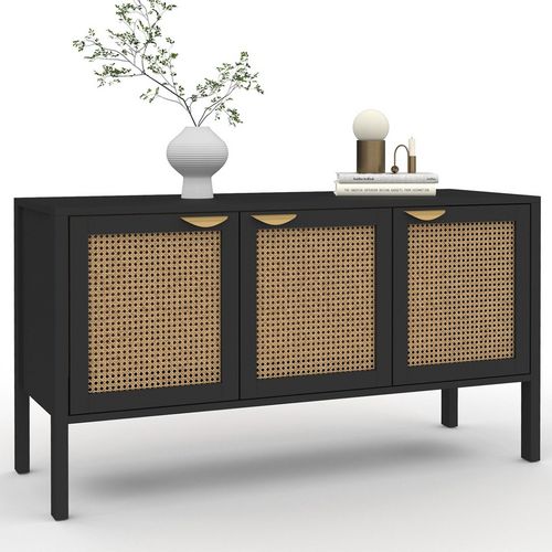 Apportez une touche naturelle et chaleureuse qui manquait à votre décoration intérieure grâce à ce buffet avec portes en cannage.Son coloris noir et ses façades de portes en cannage viendront illuminer votre salon pour une ambiance cosy et chaleureuse ! Entretien minimum, robustesse, solution de rangement... Ce meuble sera la pièce maîtresse de votre salon !Pratique et fonctionnel, le buffet enfilade EDHEN offre une grande capacité de rangement. Grâce à ses trois placards fermés par une porte dotée d'une poignée dorée élégante et facile à prendre en main, rangez vaisselle légère, électroménager ou même livres de cuisine en toute discrétion.Avec son design simple et élégant et son format compact, vous pourrez également l'utiliser dans une entrée, une chambre ou un bureau comme bibliothèque ou meuble de rangement.De plus, ses 4 pieds de 18,5 cm de hauteur, et sa structure en panneaux de particules lui assure stabilité et robustesse au quotidien.Alors n'hésitez plus et optez pour le buffet EDHEN 3 portes au look ultra tendance ! Dimensions du buffet bas 3 portes EDHENDimensions globales : Longueur 110 cm x largeur 40 cm x Hauteur 60 cmDimensions portes : L. 34,5 x H. 38 cmEncadrement porte : 3,5 cmDimensions intérieures des placards : L. 34,5 x l. 38 x H. 38,5 cmLongueur poignées : L. 10 x l. 1.5 x H. 2 cmHauteur par rapport au sol : 18,5 cmDimensions des pieds : 2,5 x 4 cmStructure en panneaux de particules de bois (PB) + cannage en plastiqueColoris : noir et cannageÀ monter soi-mêmeÀ associer avec le buffet d'appoint EDHEN pour un total look cannage dans votre salon !
