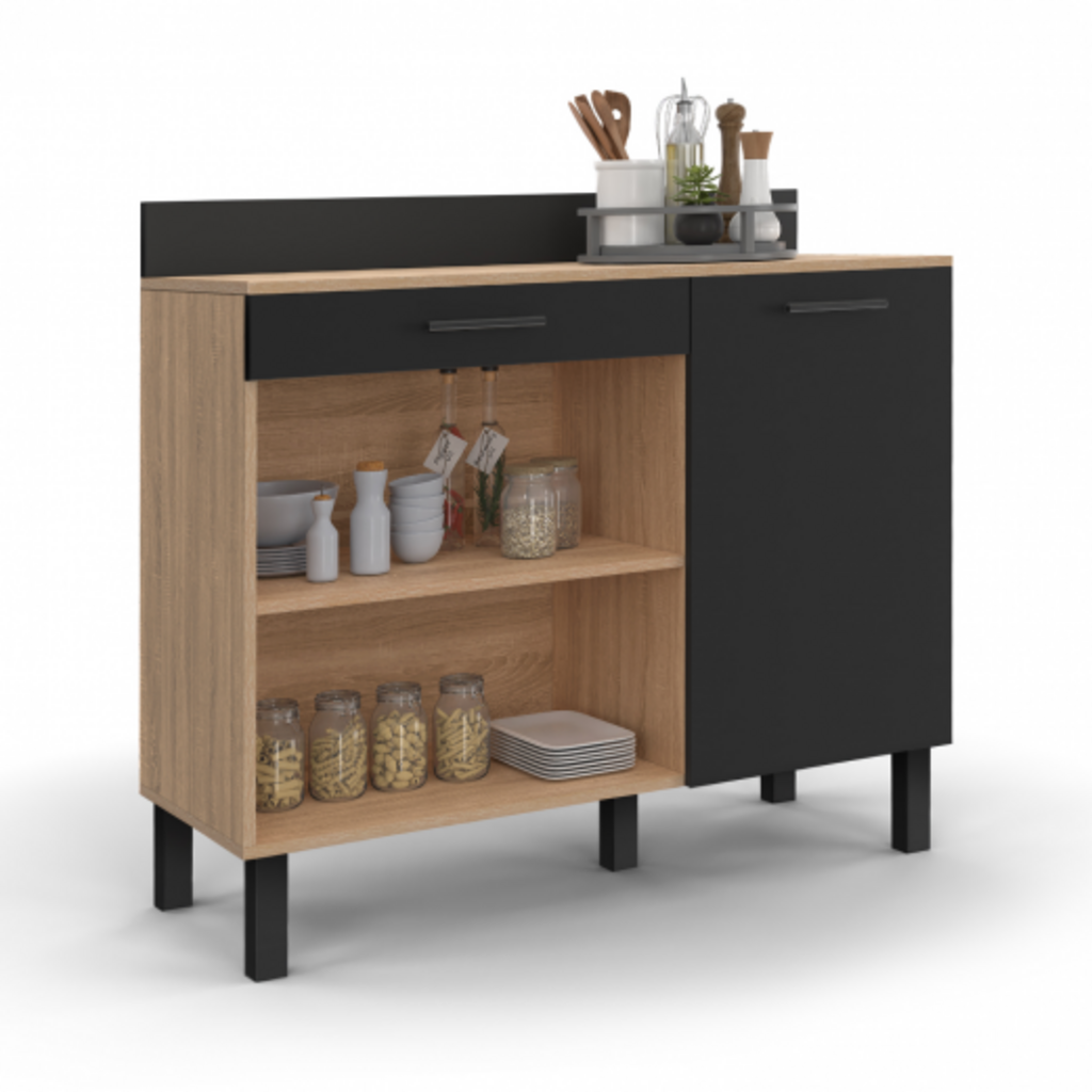 Buffet bas de cuisine 100 CM CINA plan de travail H.83 cm 1 porte + 1 tiroir façon hêtre et noir