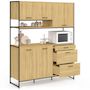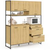 Vous souhaitez aménager votre cuisine avec un meuble pratique et fonctionnel ? Pensez au buffet de cuisine vaisselier DETROIT. Grâce à ses 5 placards ainsi qu'à ses 3 tiroirs, vous bénéficiez d'un espace de rangement XXL fermé. La partie basse du meuble est équipée de 2 placards et de 3 tiroirs. Grâce à ces 2 placards, vous pourrez ranger vos assiettes, poêles, casseroles et autres ustensiles de cuisine. Tandis que dans la partie de gauche, 3 tiroirs, vous pourrez organiser vos couverts, ustensiles de cuisine et assiettes.La partie centrale du buffet facilite le rangement des objets que l'on souhaite avoir à portée de main, comme des livres de cuisine, des bocaux, ou des paniers avec des fruits et légumes. La hauteur du plan de travail est à 83 cm du sol pour faciliter l'utilisation au quotidien.Ce meuble de cuisine DETROIT est également composé de 3 placards hauts avec étagère ajustable et d'une niche, qui accueilleront vos aliments ou vos verres les plus fragiles. À vous de choisir l'agencement de votre meuble de cuisine ! Grâce à son look industriel, en panneaux de particules mélaminés et métal noir, vous pourrez l'intégrer dans tous les styles de décoration, dans votre cuisine ou votre cellier. Profitez-en pour apporter une note tendance à votre intérieur ! Faites-vous plaisir et choisissez ce meuble pratique et esthétique pour votre cuisine. Plus qu'un simple meuble de rangement, le buffet de cuisine casserolier DETROIT vous permet de stocker et de garder à portée de main tout le nécessaire de votre cuisine.Dimensions du buffet de cuisine casserolier 140 cm DETROIT Dimensions globales : Longueur 140 cm x largeur 40 cm x Hauteur 176,5 cmHauteur des pieds : 13 cmHauteur plan de travail : 83 cmDimensions façade petit tiroir : L. 56,5 x H. 11 cmDimensions intérieures petit tiroir : L. 52,5 x l. 35 x H. 6 cmDimensions façade grand tiroir : L. 56,5 x H. 26,5 cmDimensions intérieures grand tiroir : L. 52,5 x l. 35 x H. 18 cmFaçades portes inférieures : 37 x 64,5 cmDimensions intérieures placard inférieurs : 75 x 33,5 x 65 cm - avec une étagère ajustableDimensions de la niche : 76,5 x 40 x 14 cmDimensions portes supérieures gauches : 37 x 39,5 cmDimensions intérieures placard supérieur gauche : 74 x 36 x 40 cmDimensions portes supérieure droite: 56,5 x 52,5 cmDimensions intérieures placard haut à droite : 57 x 33,5 x 53 - cm avec une étagère ajustableMatériaux : panneaux de particules de bois (PB) et métalColoris : bois et noirÀ monter soi-mêmeRetrouvez l'ensemble de nos éléments de cuisine sur notre boutique en ligne !