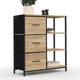 Découvrez le buffet d'appoint 3 tiroirs et étagères 70 cm UTAH design industriel en bois et métal noir ! Doté de multiples rangements, il mettra en valeur vos objets déco tout en gardant votre pièce bien ordonnée !Bi-matière, ce meuble gain de place s'adaptera facilement aux différentes pièces de votre maison quel que soit votre intérieur grâce à ses coloris sobres bois et noir.Ses 3 bacs en tissu vous offriront des compartiments de rangements fermés pour conserver vos affaires à l'abri de la poussière et des regards tandis que vous pourrez exposer vos plus beaux objets déco sur les 3 étagères latérales ouvertes !Vous pouvez également utiliser le dessus du meuble pour disposer vide-poche, lampe ou encore petite plante verte.Avec ses différents espaces de rangements et ses dimensions astucieuses, utilisez ce meuble pratique dans une cuisine, une entrée, un bureau ou même dans une chambre comme bibliothèque d'appoint !Sa structure en panneaux de particules de bois et métal lui assure stabilité et robustesse tout en participant à son look résolument factory.Optez pour le design industriel malin avec ce buffet d'appoint UTAH !Dimensions du buffet d'appoint 3 étagères et tiroirs UTAHDimensions globales : Longueur 70 cm x largeur 30 cm x Hauteur 80 cmDimensions d'une étagère : L. 32,5 x l. 30 cmEspace entre chaque étagère : 21 cmHauteur des pieds : 5 cmDimensions intérieures d'un tiroir : L. 31,5 x l. 28,5 x H. 22 cmDimensions façade d'un tiroir : L. 32,5 x H. 22,5 cmMatériaux : Particules de bois, métal et fibre non tisséeColoris : Bois et noirÀ monter soi-même Retrouvez l'ensemble de notre collection industrielle sur notre boutique en ligne !